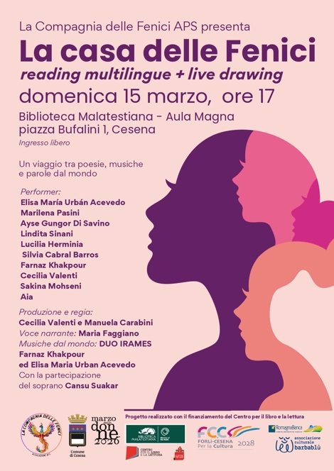 In occasione del progetto Centro per il libro e la lettura e per il mese della donna, il 15 marzo alle ore 17 nell'aula Magna della biblioteca Malatestiana di Cesena si terrà l'evento: ' La casa delle Fenici. " con il Patrocinio del Comune di Cesena e in collaborazione con L'Associazione Barbablu' che cura il live drawing con il disegnatore Nicolo' Mingolini, il quale in diretta disegnera' le emozioni delle poesie che verranno lette dalle 10 fenici in scena, con l'accompagnamento musicale di brani dal mondo del Duo Irames.